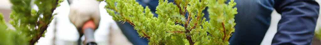 A row of arborvitae trees (Thuja orientalis) lining a fence